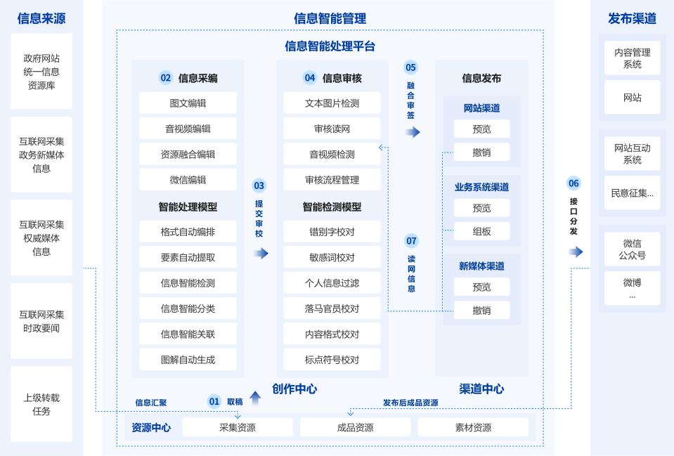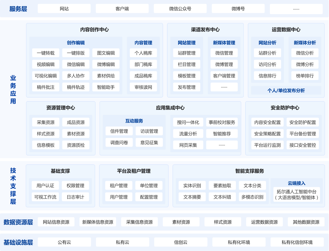 平台在传统网站管理的基础上,引入智能化管理技术和全媒体发布渠道,建立统一的媒体资源库,涵盖了信息采集、创作编辑、内容管理、渠道发布、运营分析等全周期的管理,以及资源管理、应用集成、应用开发、租户管理、智能服务和安全防护等基础支撑。平台以智能化视角出发,以人工智能大模型、文本挖掘、自然语言处理等多种先进技术为支撑,构建一个更安全、更统一、更智能的新一代管理平台。